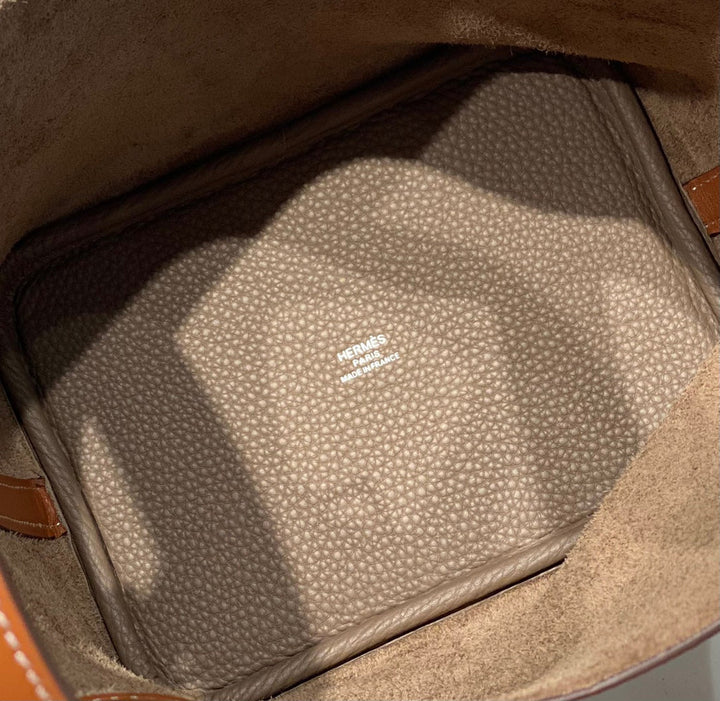 HERMES 25S PICOTIN LOCK 18 IN BURNT ORANGE AND BROWN CALFSKIN SILVER HARDWARE